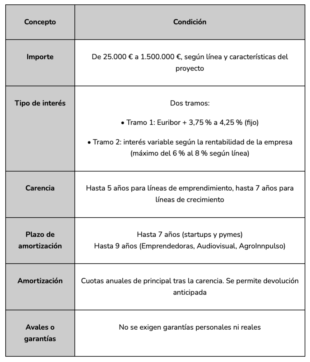 Finalidad: Financiar la puesta en marcha, crecimiento o consolidación de pequeñas y medianas empresas innovadoras en cualquier sector, apoyando especialmente proyectos con base tecnológica o de alto potencial de escalabilidad.