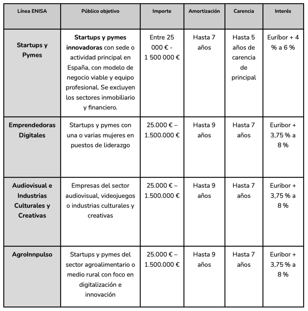 ENISA ofrece seis principales líneas de financiación, diseñadas para adaptarse a diferentes etapas de la empresa: